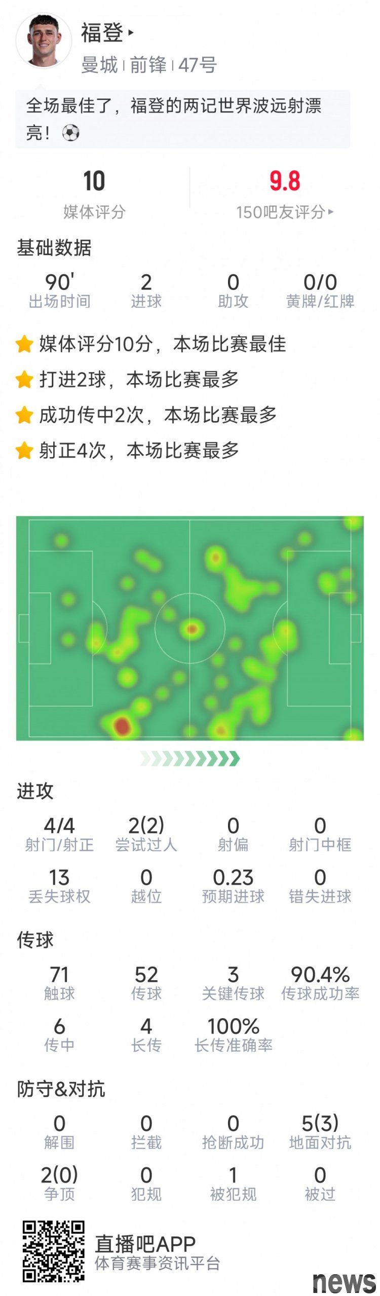 In this round of the Champions League, Manchester City defeated Dortmund 4-1. The following are Foden's statistics for this game: 90 minutes of game time 2 goals 4 shots on target 2 passes 71 touches 3 key passes Passing success rate 90% 7 confr...