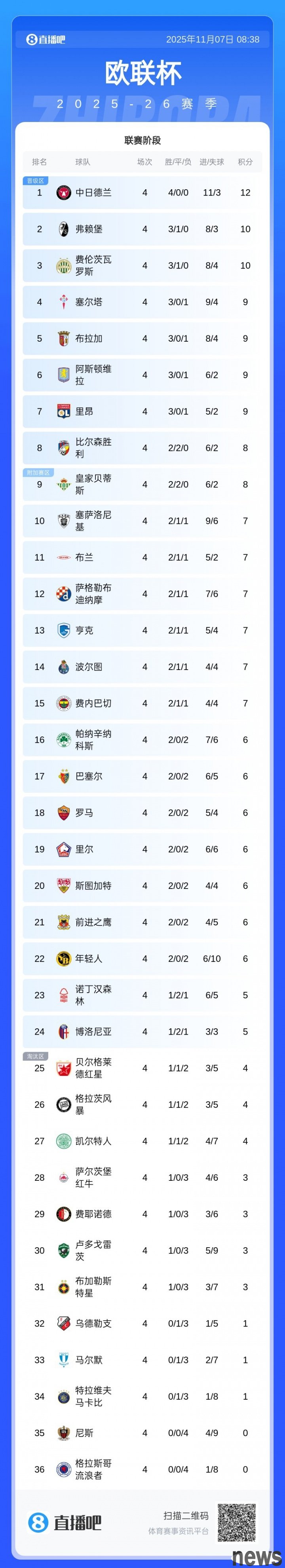 This season's Europa League has ended the first four rounds of the league stage. Currently, Midtjylland leads the standings with four wins in all games, Villa ranks 6th, Betis ranks 9th, Roma 18th, and Nottingham Forest 23rd.