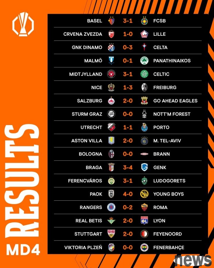 This season's Europa League has ended the first four rounds of the league stage. Currently, Midtjylland leads the standings with four wins in all games, Villa ranks 6th, Betis ranks 9th, Roma 18th, and Nottingham Forest 23rd....