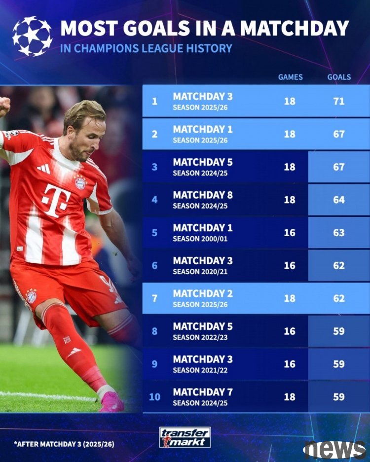 The German transfer market has counted the number of goals scored in a single round of the Champions League and listed the ranking of goals scored in a single round in the history of the Champions League. This round of Champions League scored 71 goa...