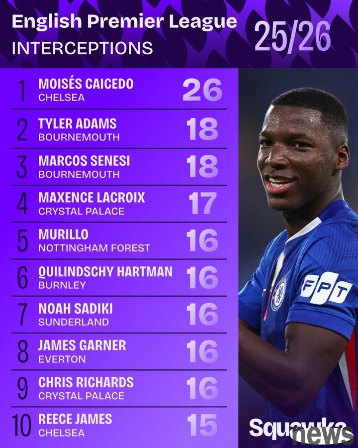 The Premier League has gone on for 11 rounds. Squakwa also counted the number of interceptions in the Premier League this season, and Caicedo leads the way alone. Premier League interceptions list this season: 1. Moises Caicedo, Chelsea, 26 times 2....