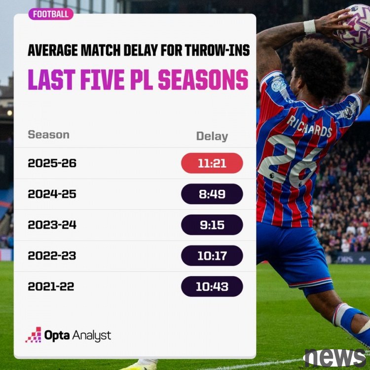 Opta data shows that the average waiting time for a throw-in in the Premier League this season is 11.21 seconds, the longest in the past five years. 2021/22 season 10.43 seconds 2022/23 season 10.17 seconds 2023/24 season 9.15 seconds 2024/25 season...