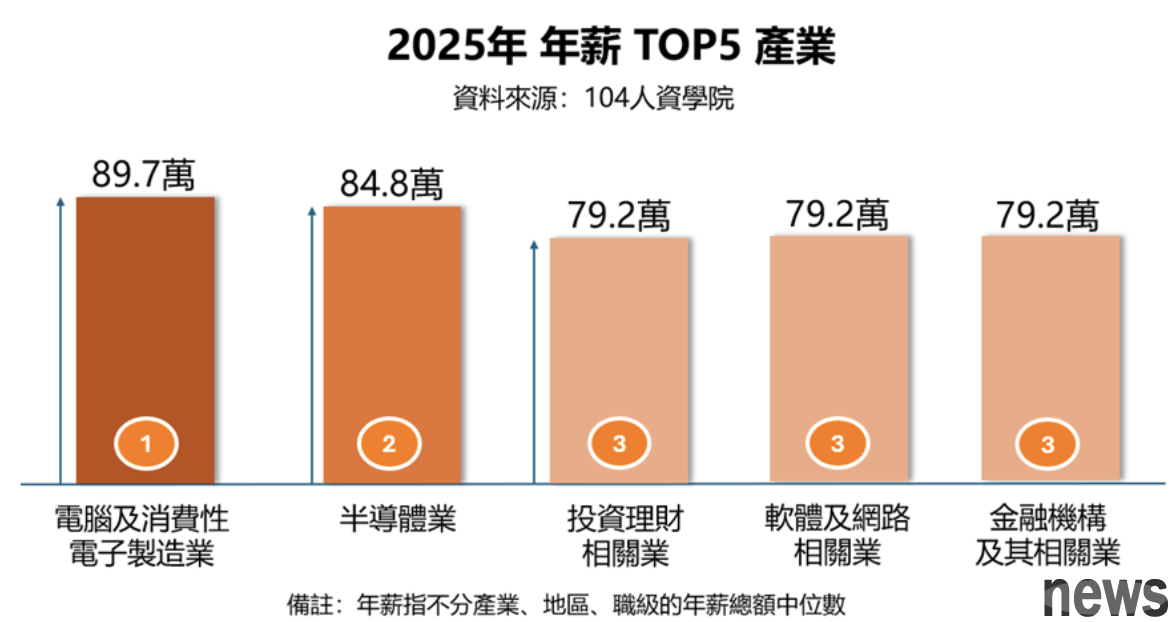 Overview, the overall median annual salary (including fixed annual salary, fixed bonus, and variable bonus) in Taiwan in 2025 is NT$673,000. Among them, the technology and financial industries continue to dominate the top of the salary pyramid with their strong profitability and high demand for key talents. The top five industries with the highest annual salary are computer and consumer electronics manufacturing NT$897,000, semiconductor industry NT$848,000, and investment and financial management-related industries NT$79.2 Ten thousand yuan, software and network-related industries 792,000 yuan, financial institutions and related industries 792,000 yuan.