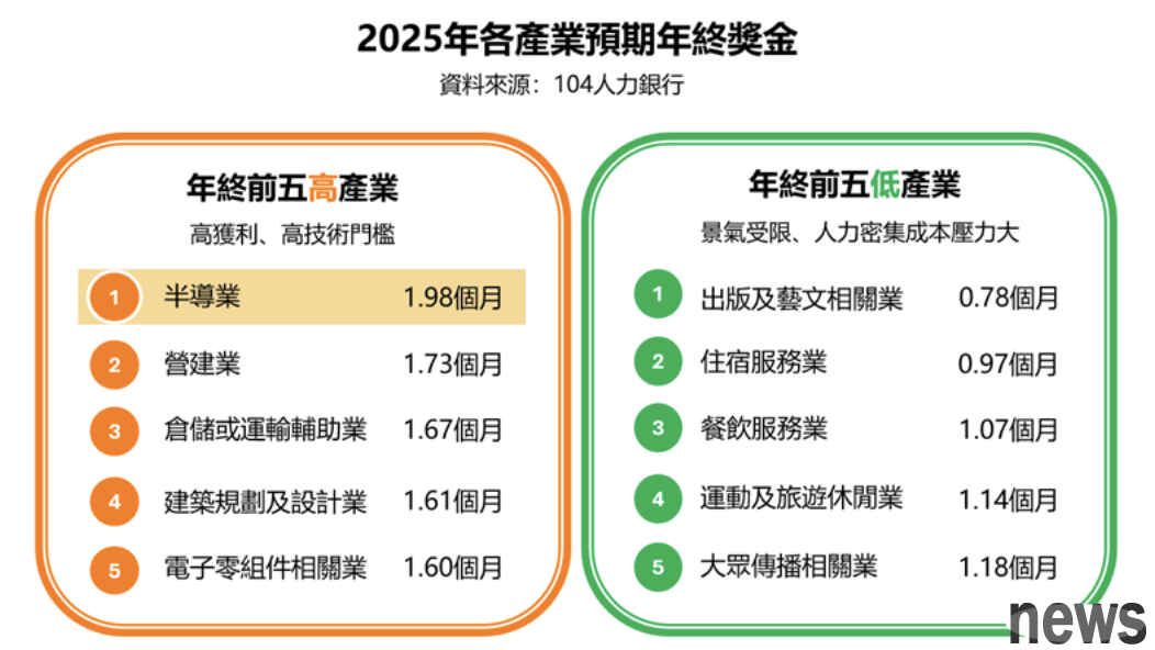Taking a closer look at the year-end of each industry, the top five high-paying industries are the semiconductor industry 1.98 months, the construction industry 1.73 months, the warehousing or transportation auxiliary industry 1.67 months, the architectural planning and design industry 1.61 months, and the electronic component-related industry 1.6 months. These high-bonus industries mostly have the characteristics of high profits or high technology thresholds, and can still maintain stable reward levels in a changing economic environment.